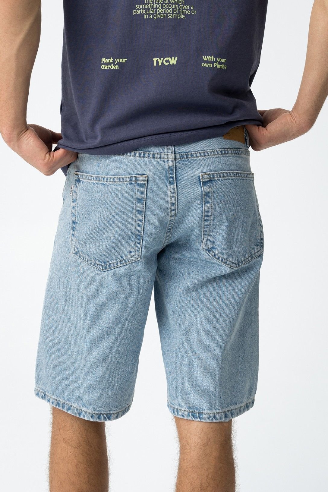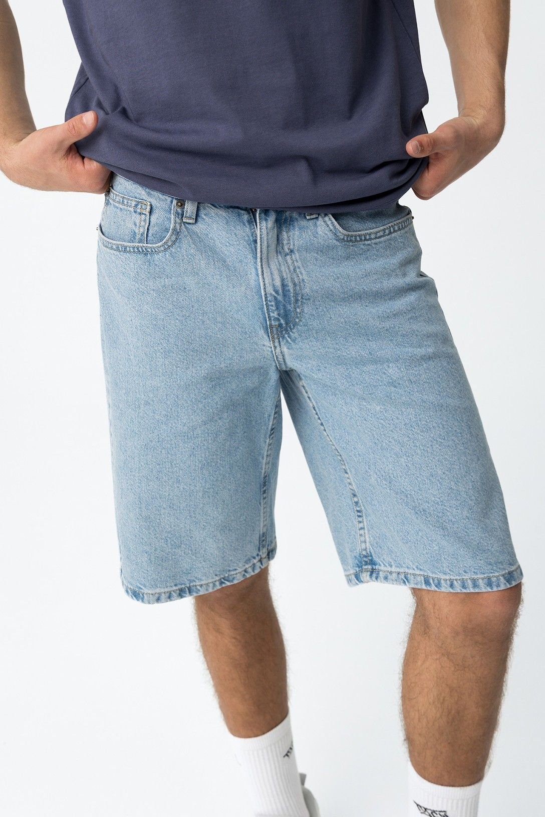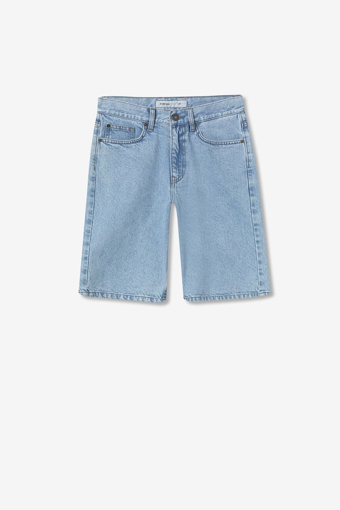 Calções denim com cinco bolsos. Fecho de correr e botão metálico à frente.