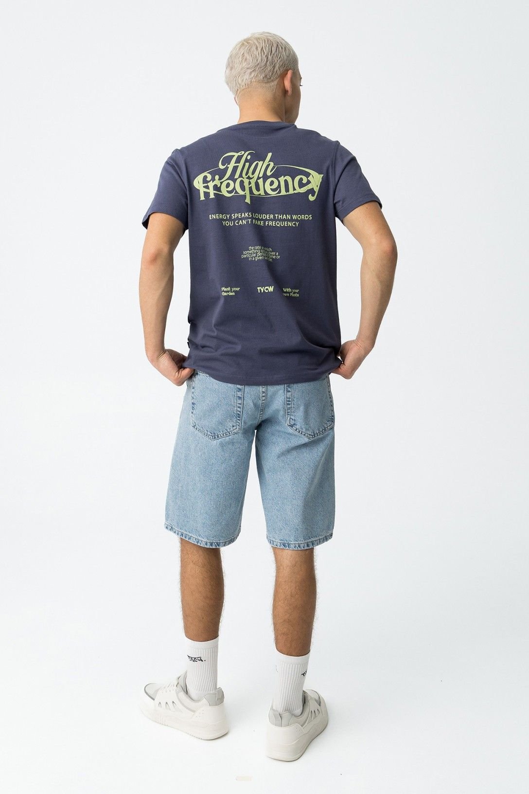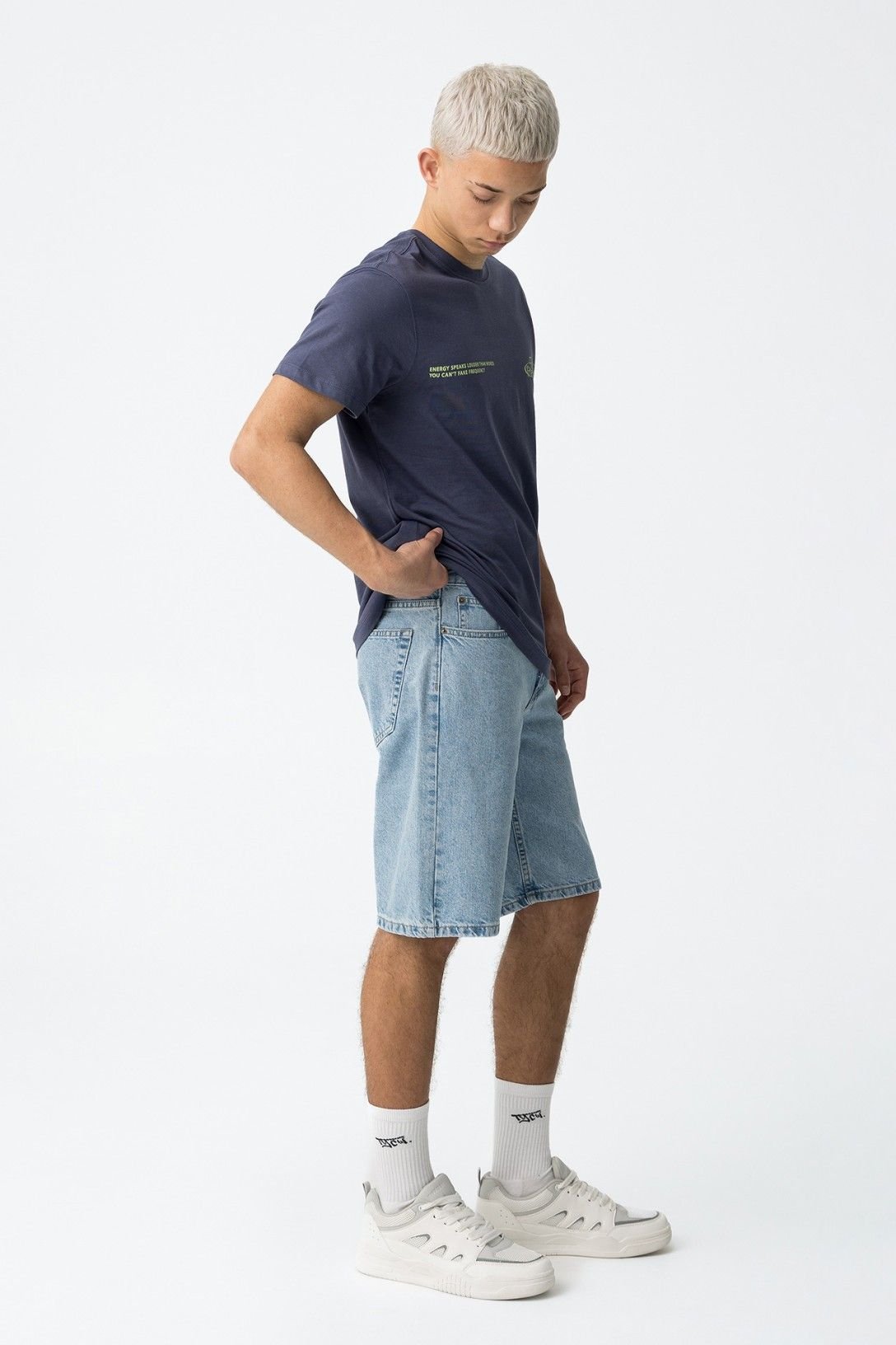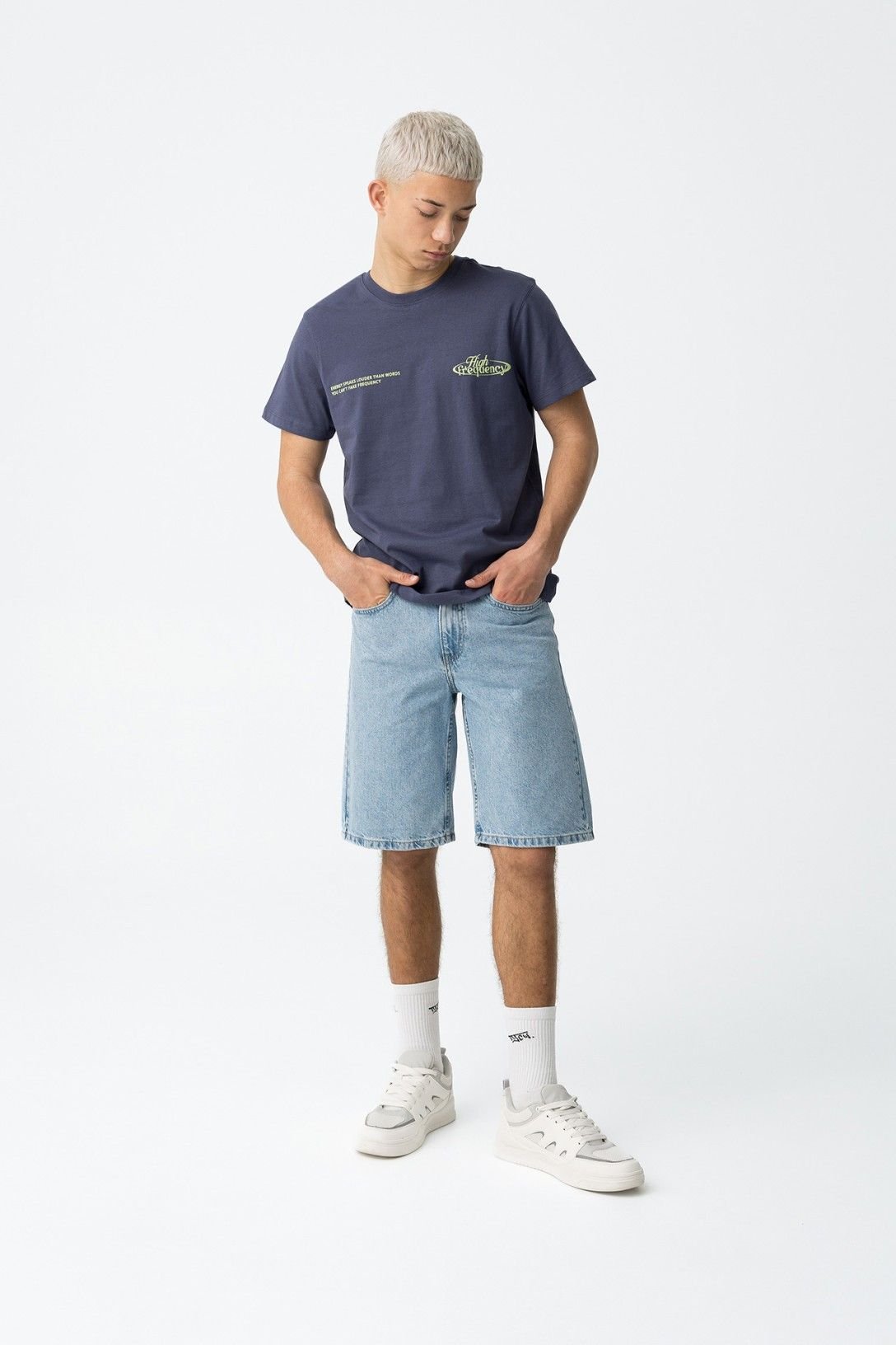 Calções denim com cinco bolsos. Fecho de correr e botão metálico à frente.