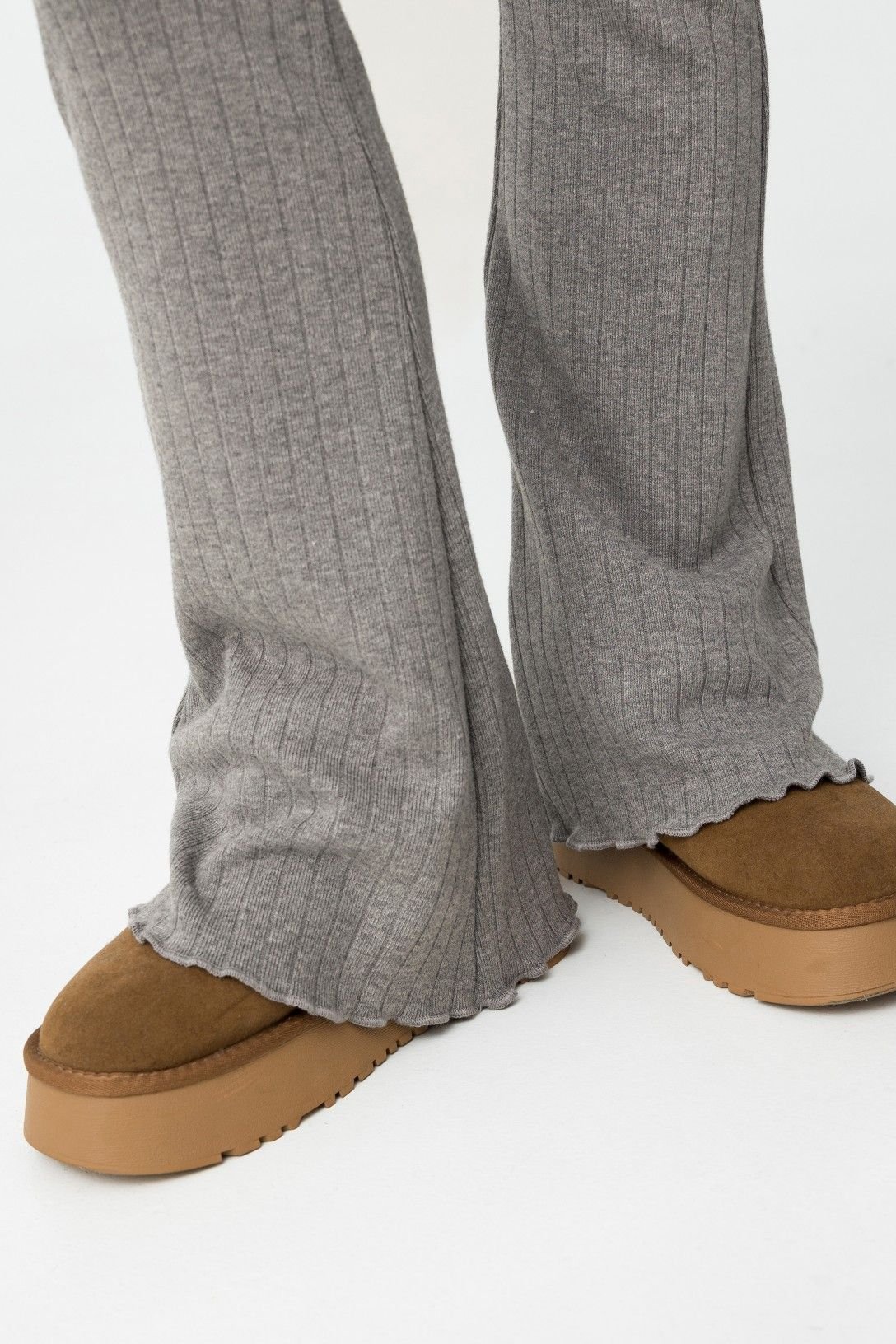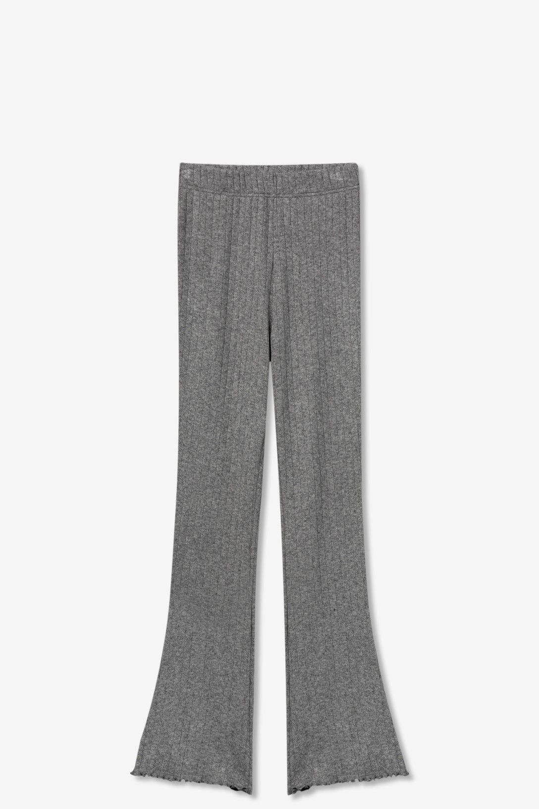 Calças flare de malha canelada, com cintura elástica alta, perna flare e bainha ondulada.