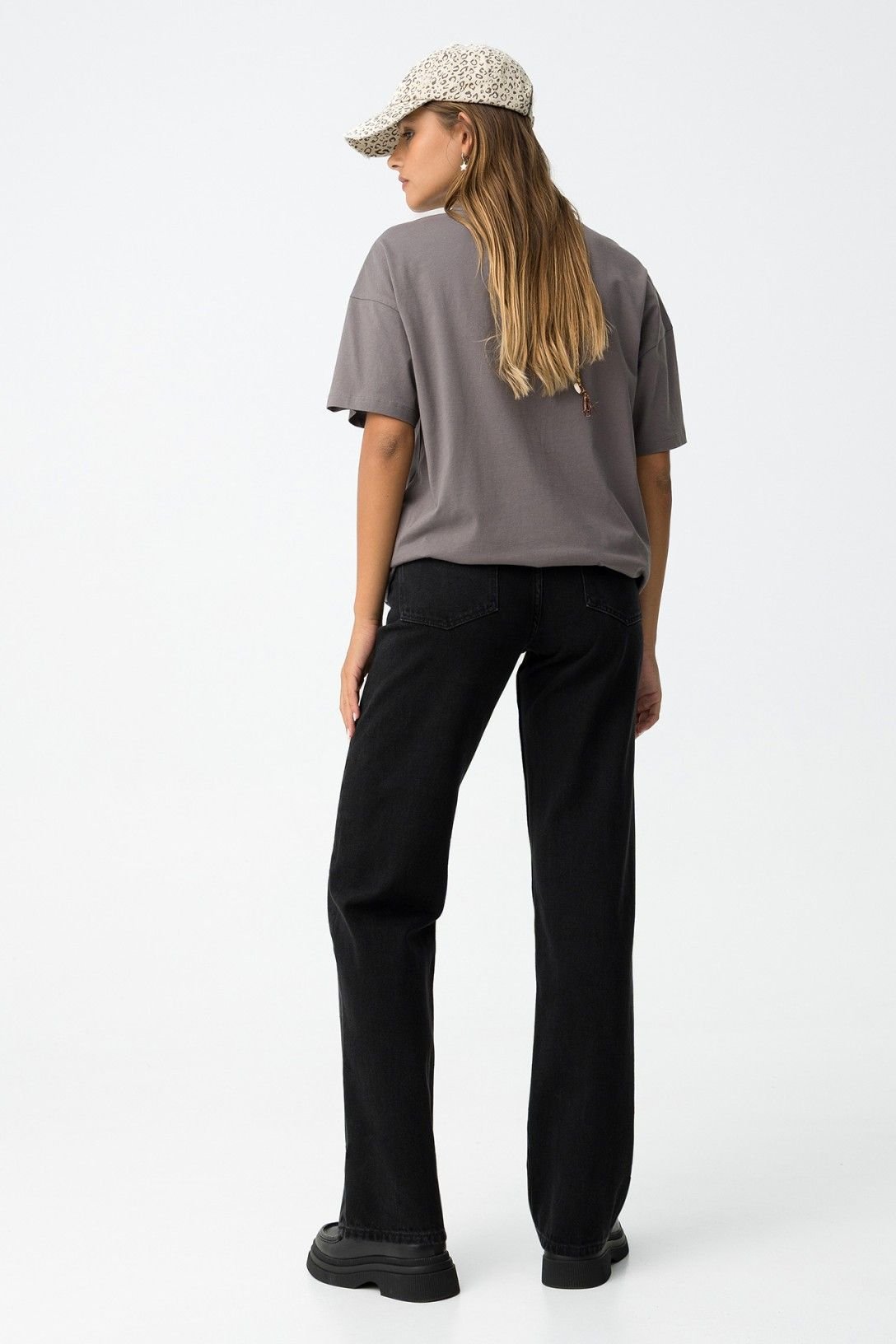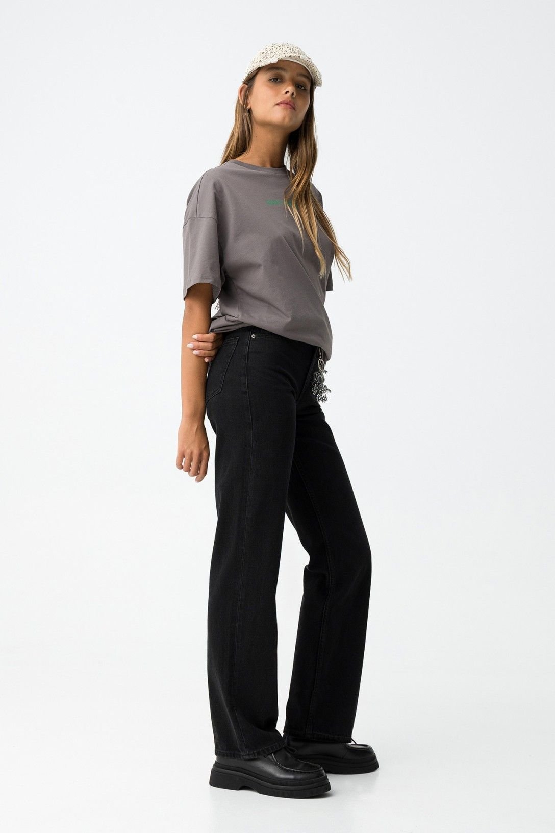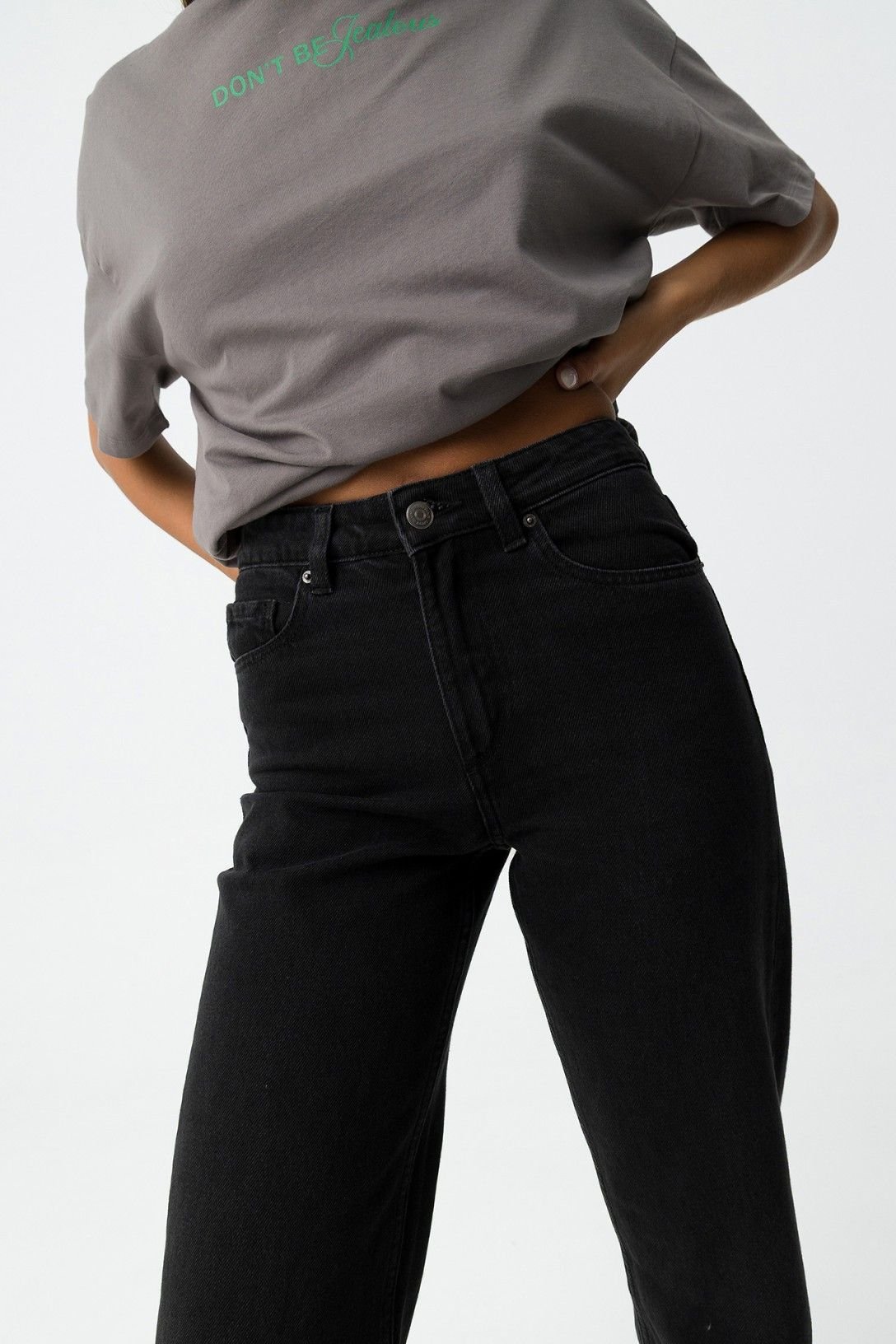 Jeans de cintura alta e perna reta com cinco bolsos. Fecho frontal de correr e botão metálico.