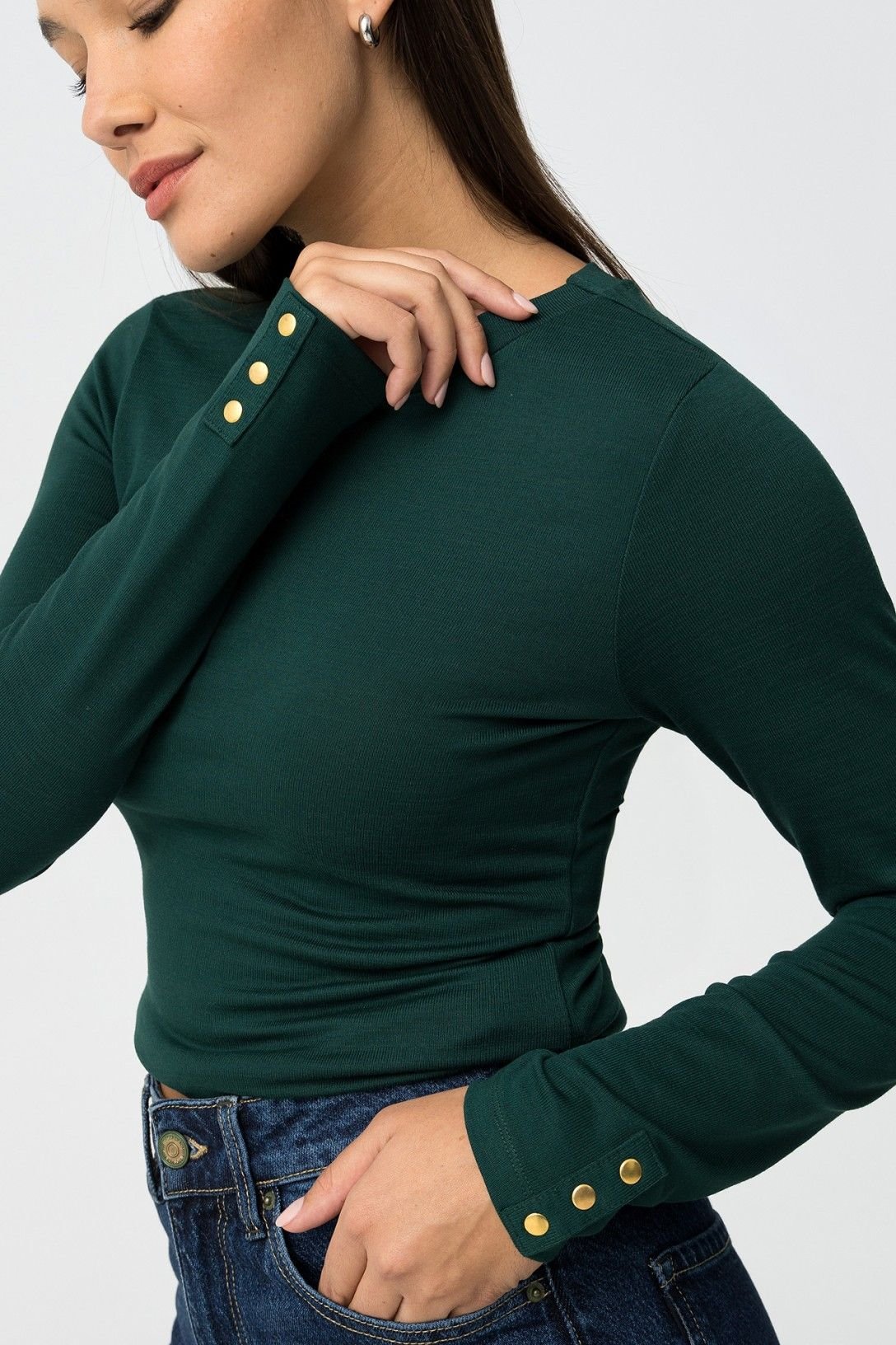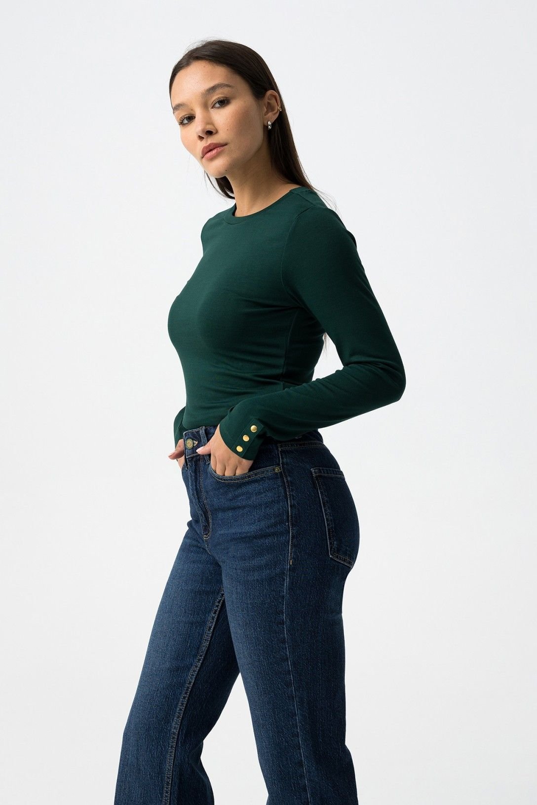 T-shirt slim fit, de manga comprida com gola redonda. Detalhe de botões metálicos nos punhos.