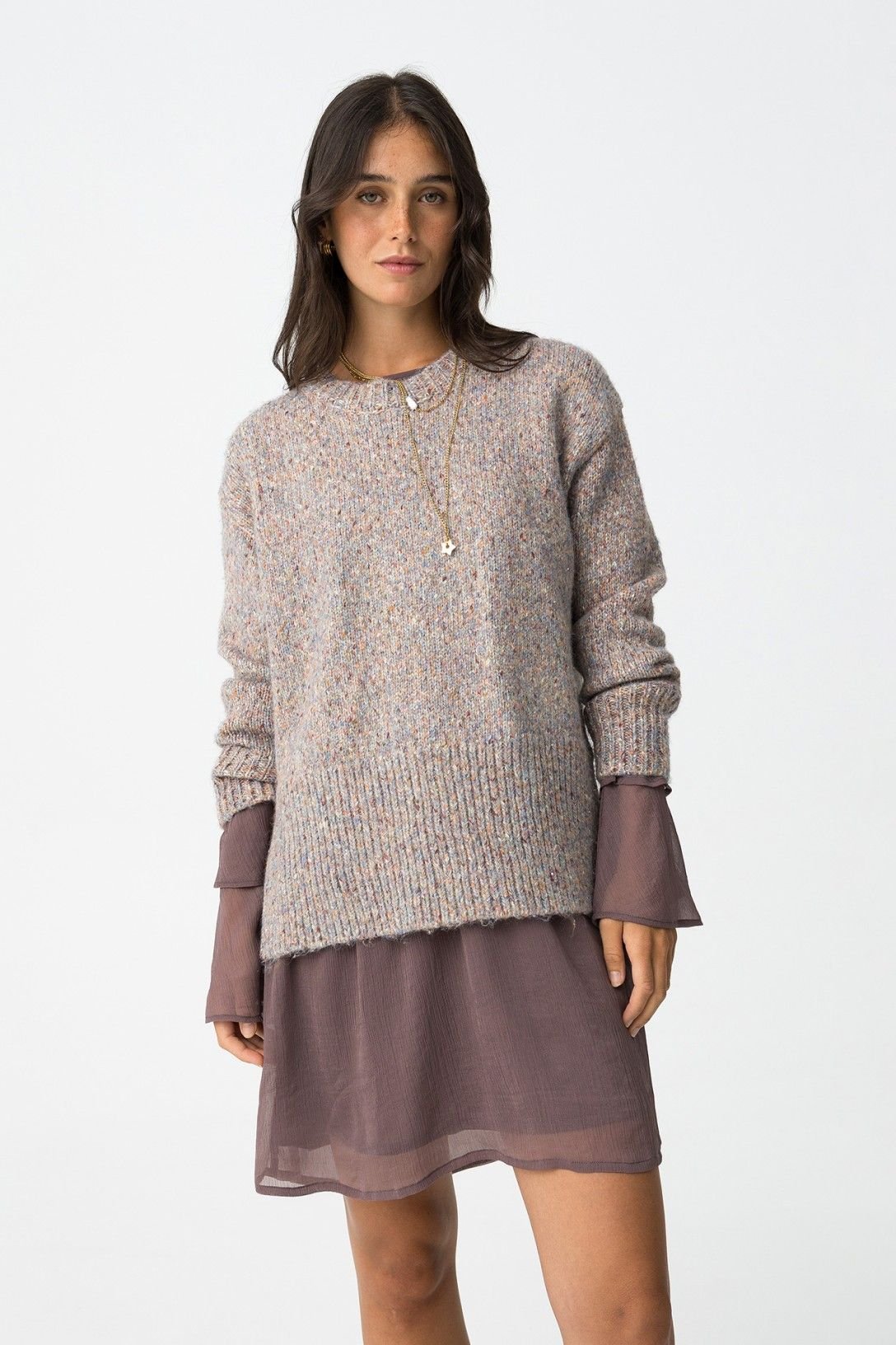 Camisola regular fit em malha tricotada com lã, fio metálico inserido e lantejoulas. Decote redondo, manga longa, terminações em ponto canelado e bainha com fendas laterais.