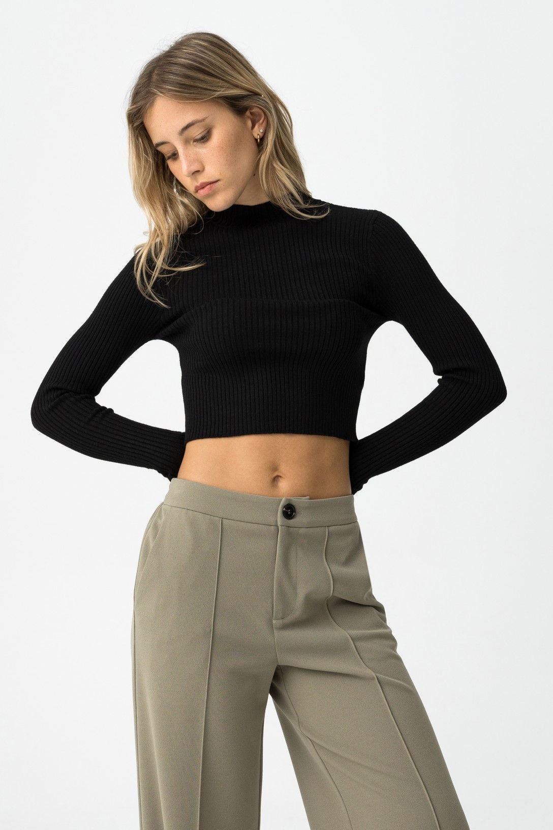 Camisola super slim fit de malha canelada, com gola média, manga longa e bainha cropped.