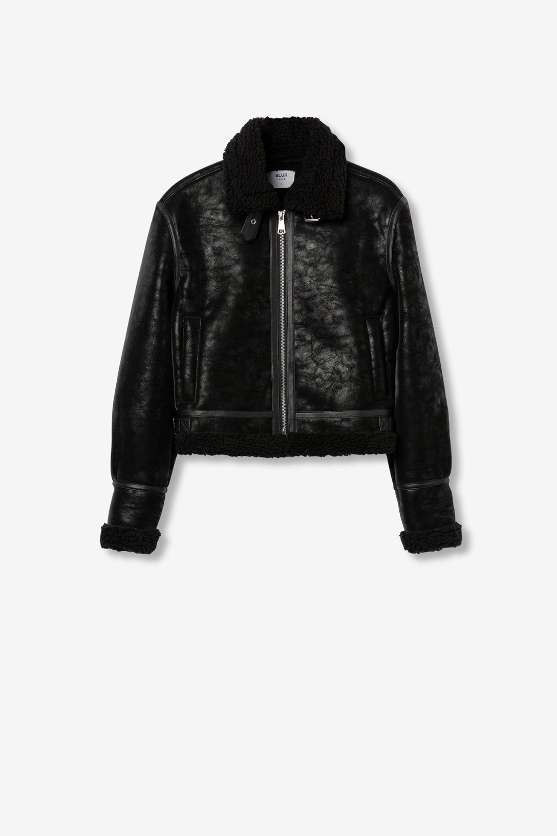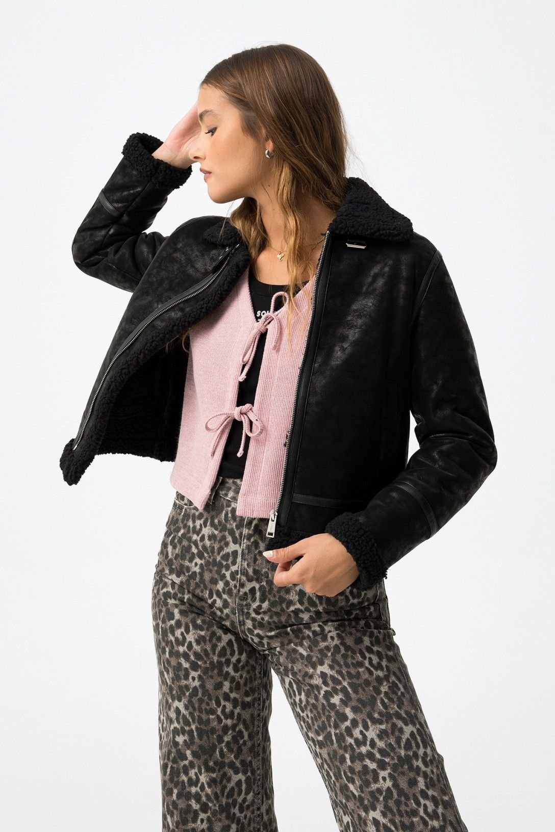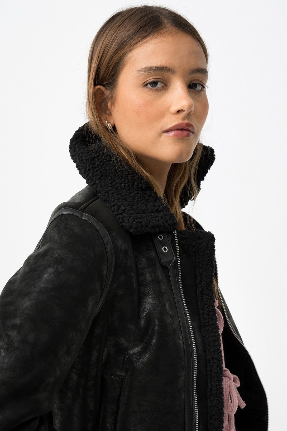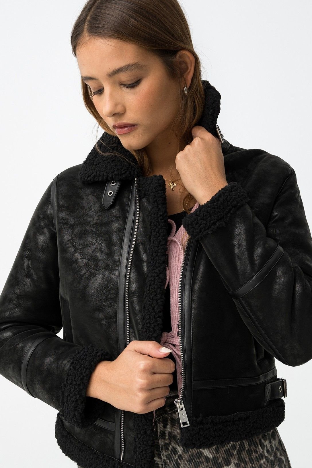 Casaco biker regular fit de efeito pele combinado com sherpa sintética, com dois bolsos frontais e fivelas decorativas. Gola colarinho com fivela, fecho de cor