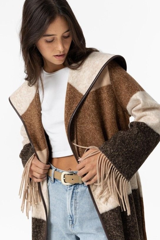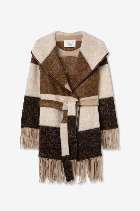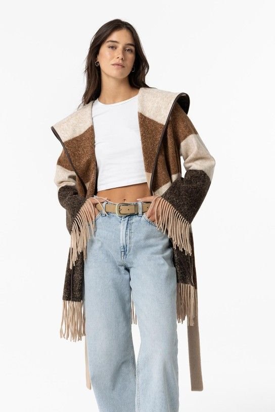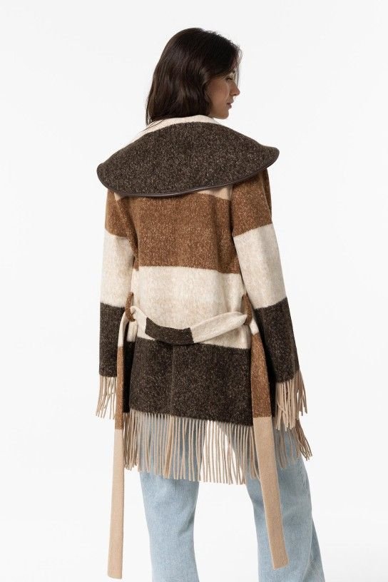 Casaco longo com riscas tricolor, lapela xale, pala nas costas e acabamento de franjas. Cinto removível de laçado