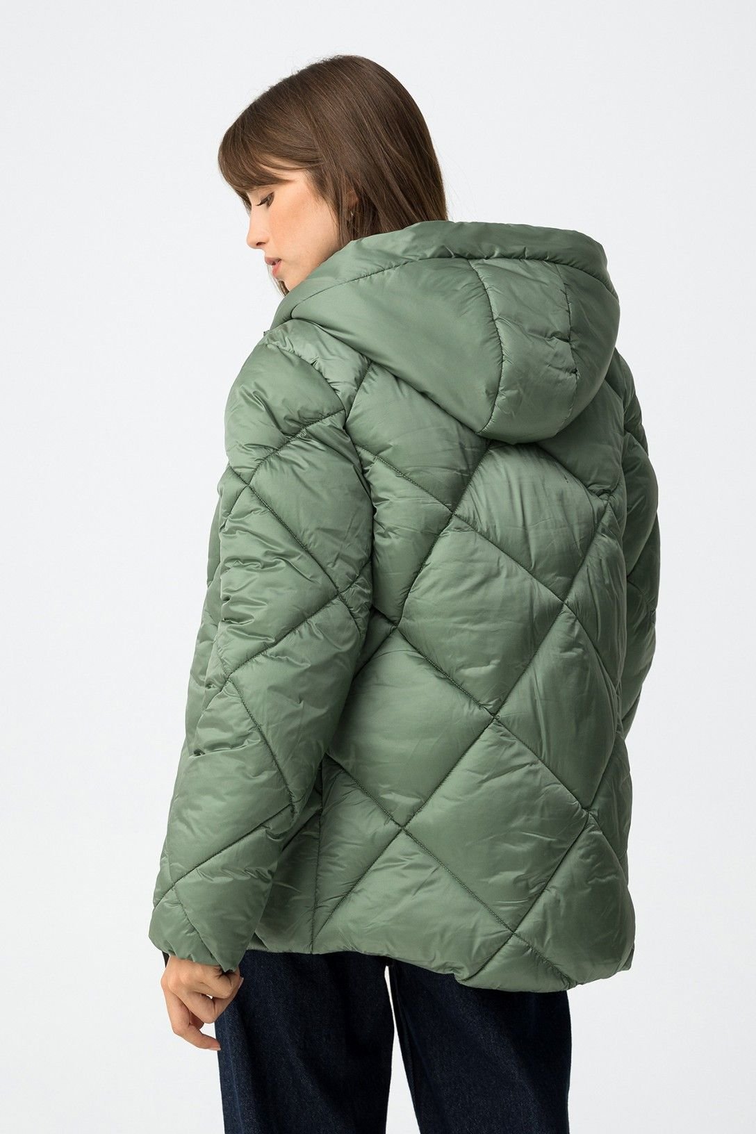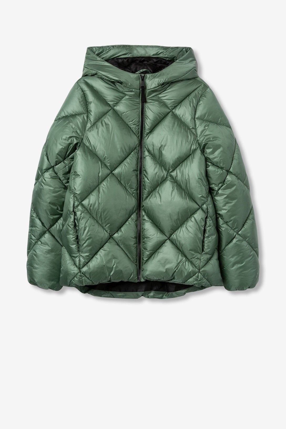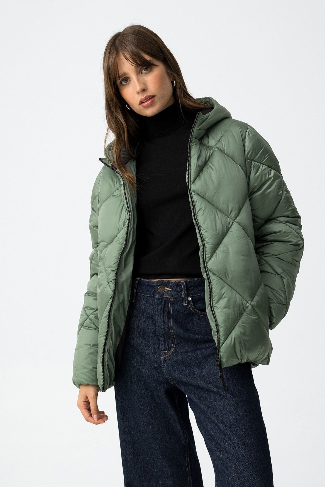 Casaco acolchoado relaxed fit, com dois bolsos frontais e fecho de correr. Capuz e manga longa com elástico nos punhos.