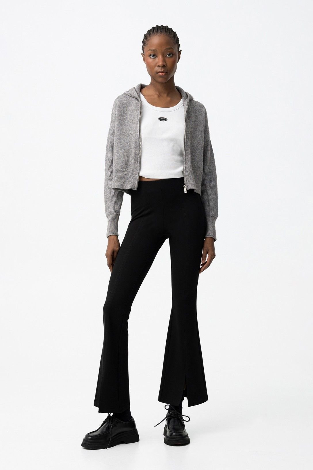 Leggings com perna flare. Tecido elástico. Cintura alta com cós largo. Abertura frontal na bainha.