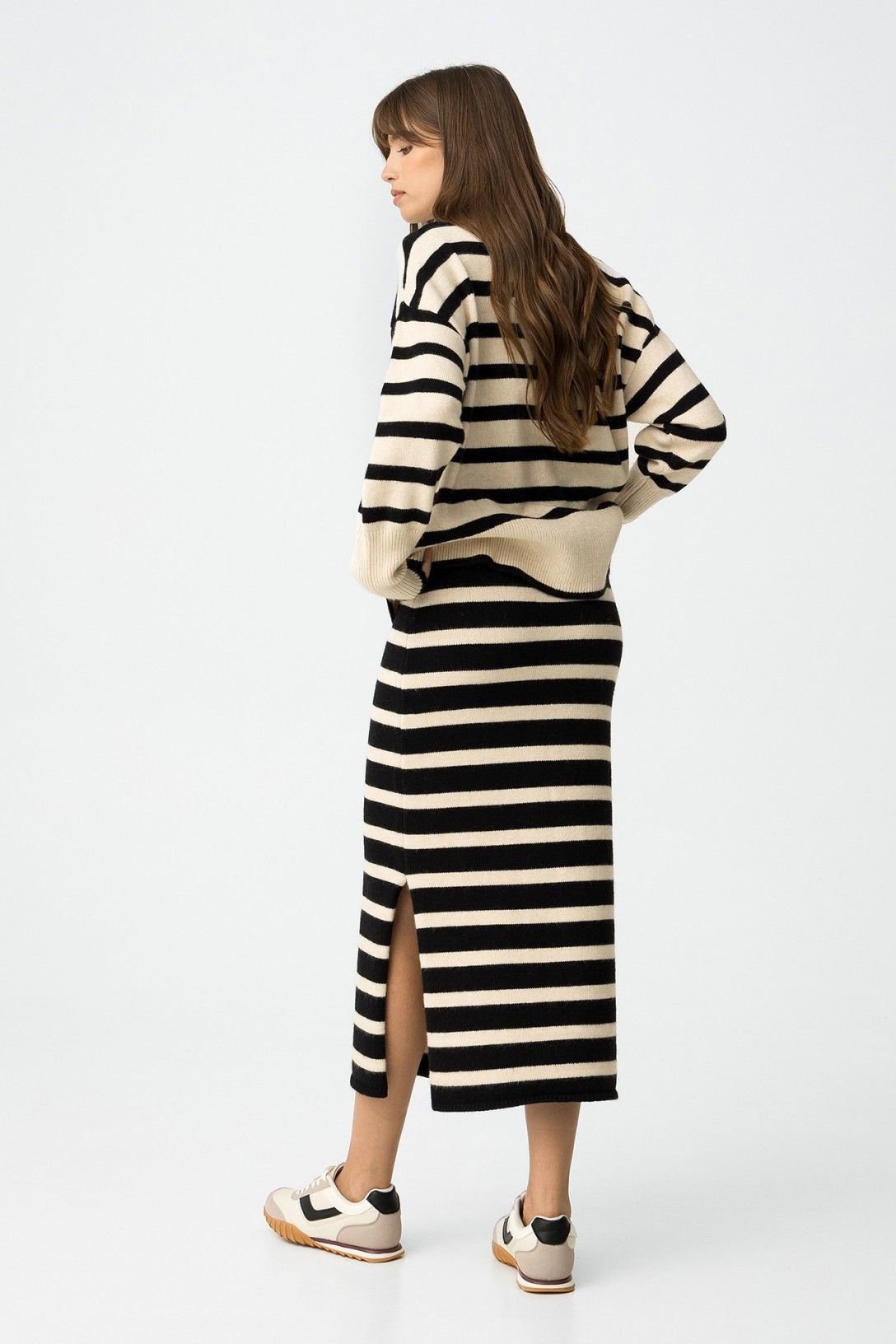 Saia midi regular fit, de malha às riscas. Com cintura elástica alta e fenda lateral na bainha.