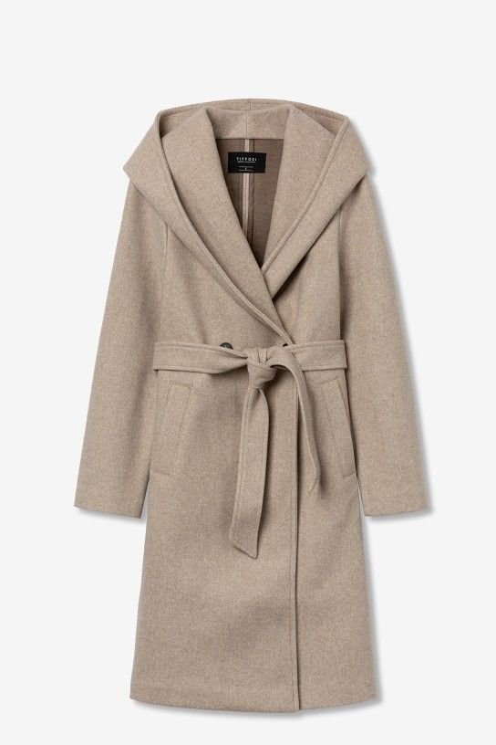Sobretudo de manga comprida e capuz. Bolsos laterais. Aplicação de cinto do mesmo tecido. Fecho frontal com botões.