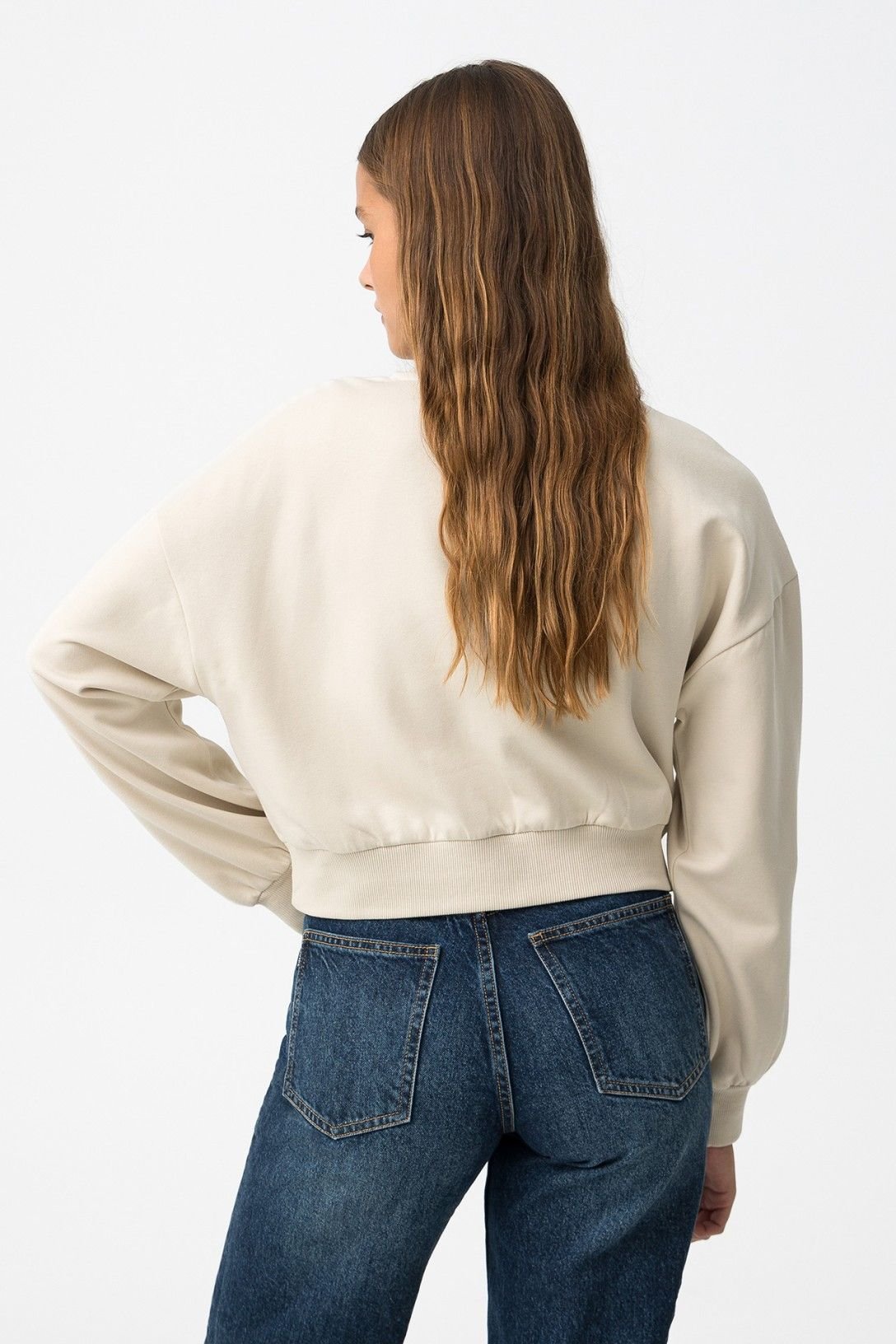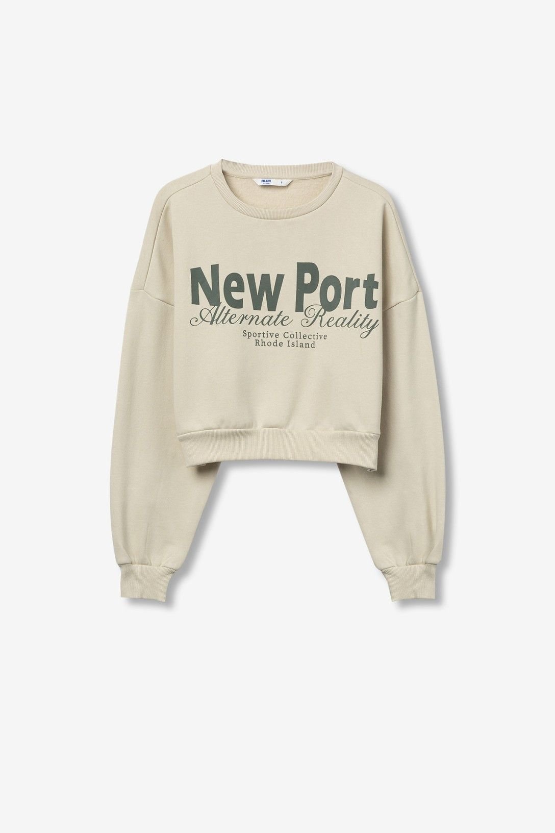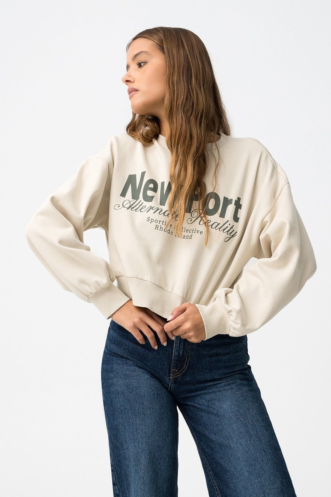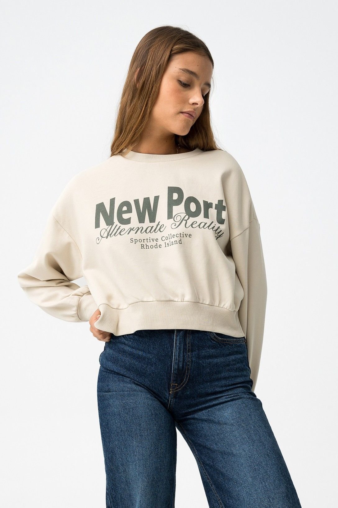 Sweat relaxed fit com estampado de mensagem frontal. Decote redondo, manga longa, bainha cropped e terminações em rib. Interior cardado.