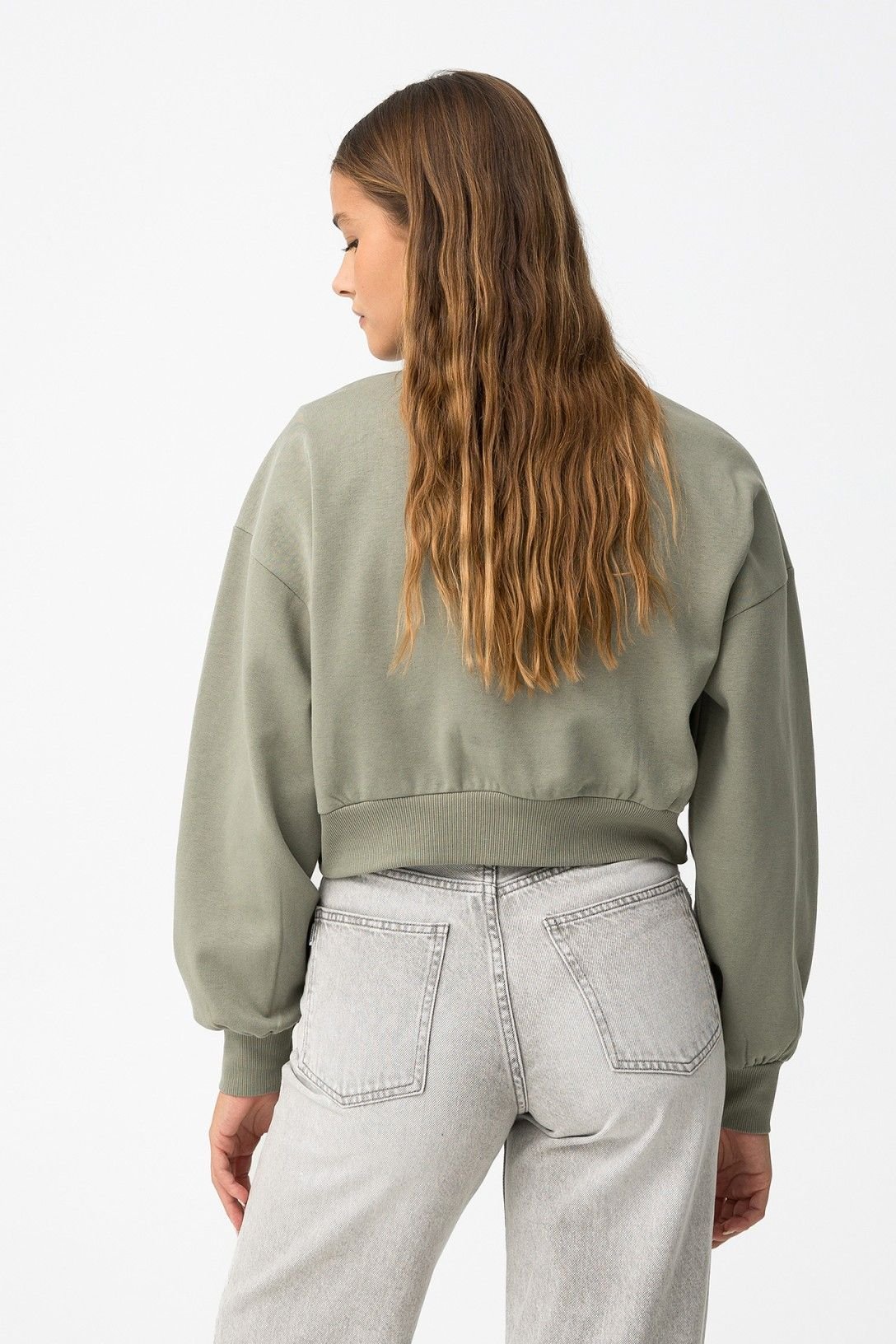 Sweat relaxed fit com estampado de mensagem frontal. Decote redondo, manga longa, bainha cropped e terminações em rib. Interior cardado.