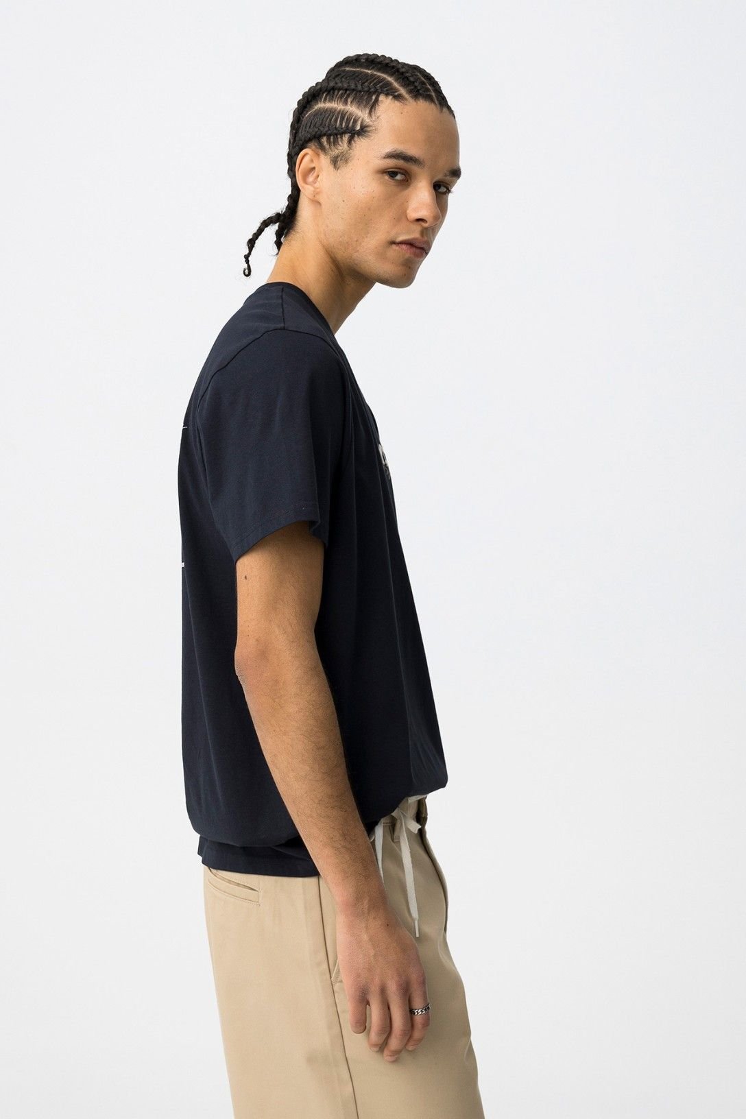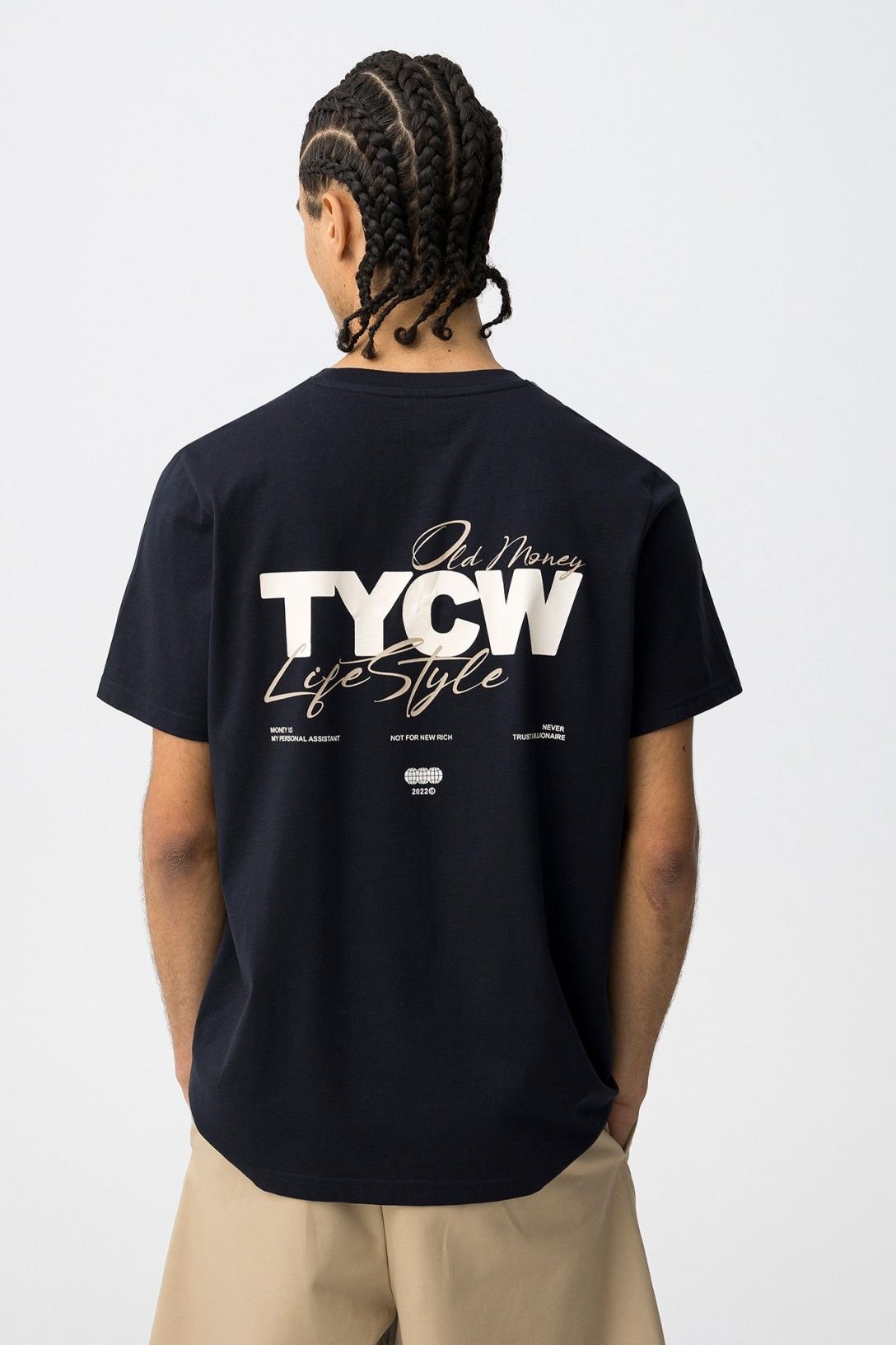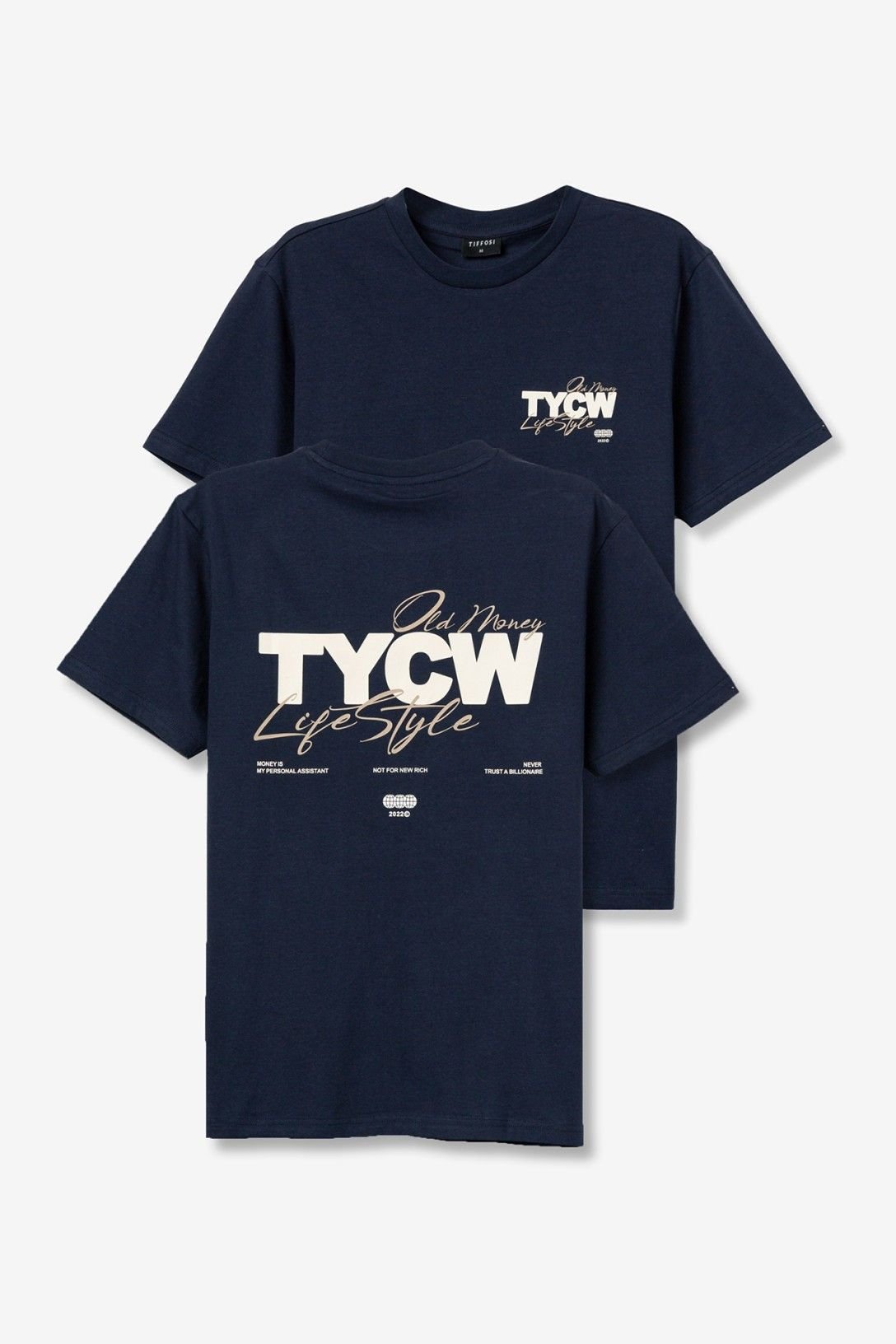 T-shirt de cor azul escuro, corte largo, estampado TYCW à frente e grande na parte de trás.