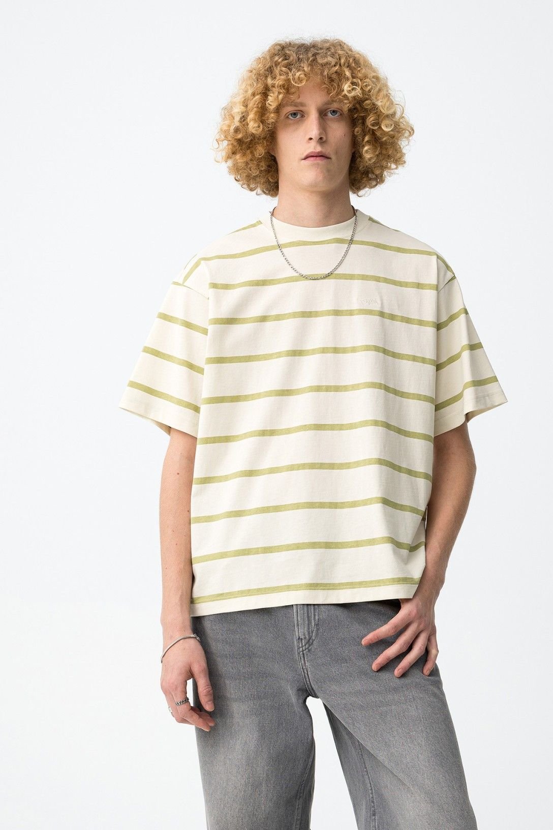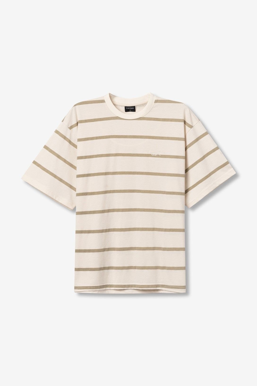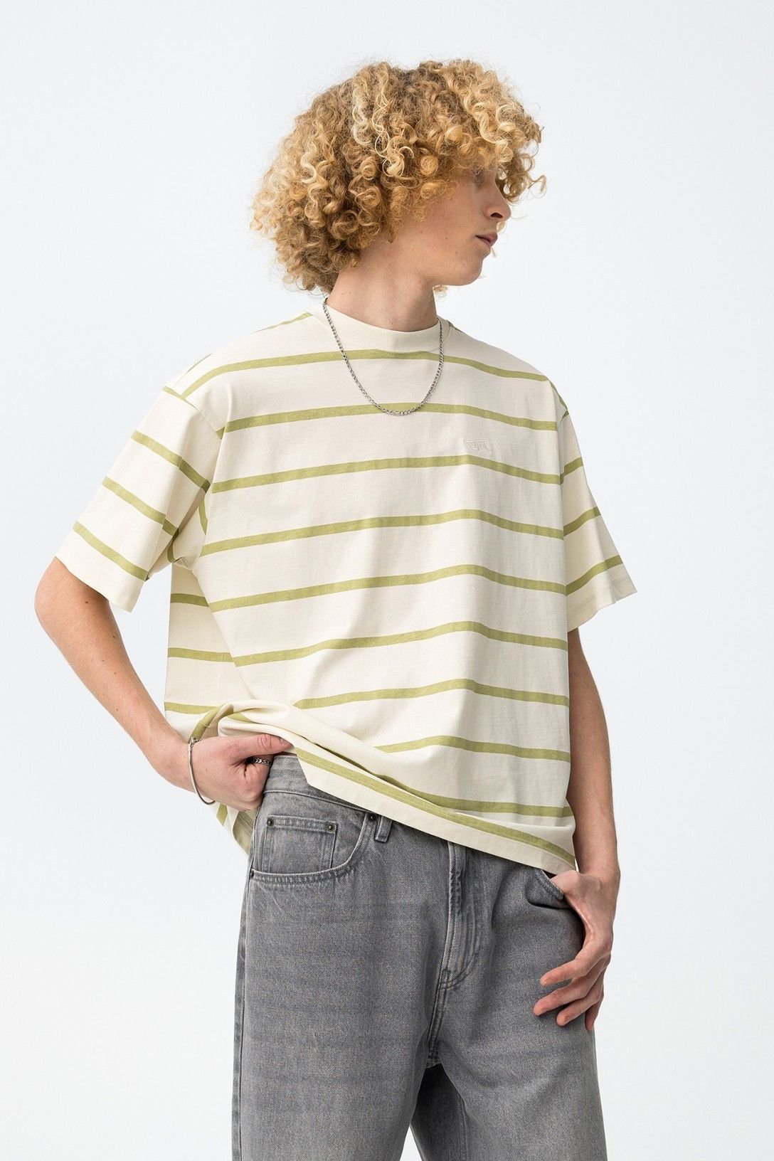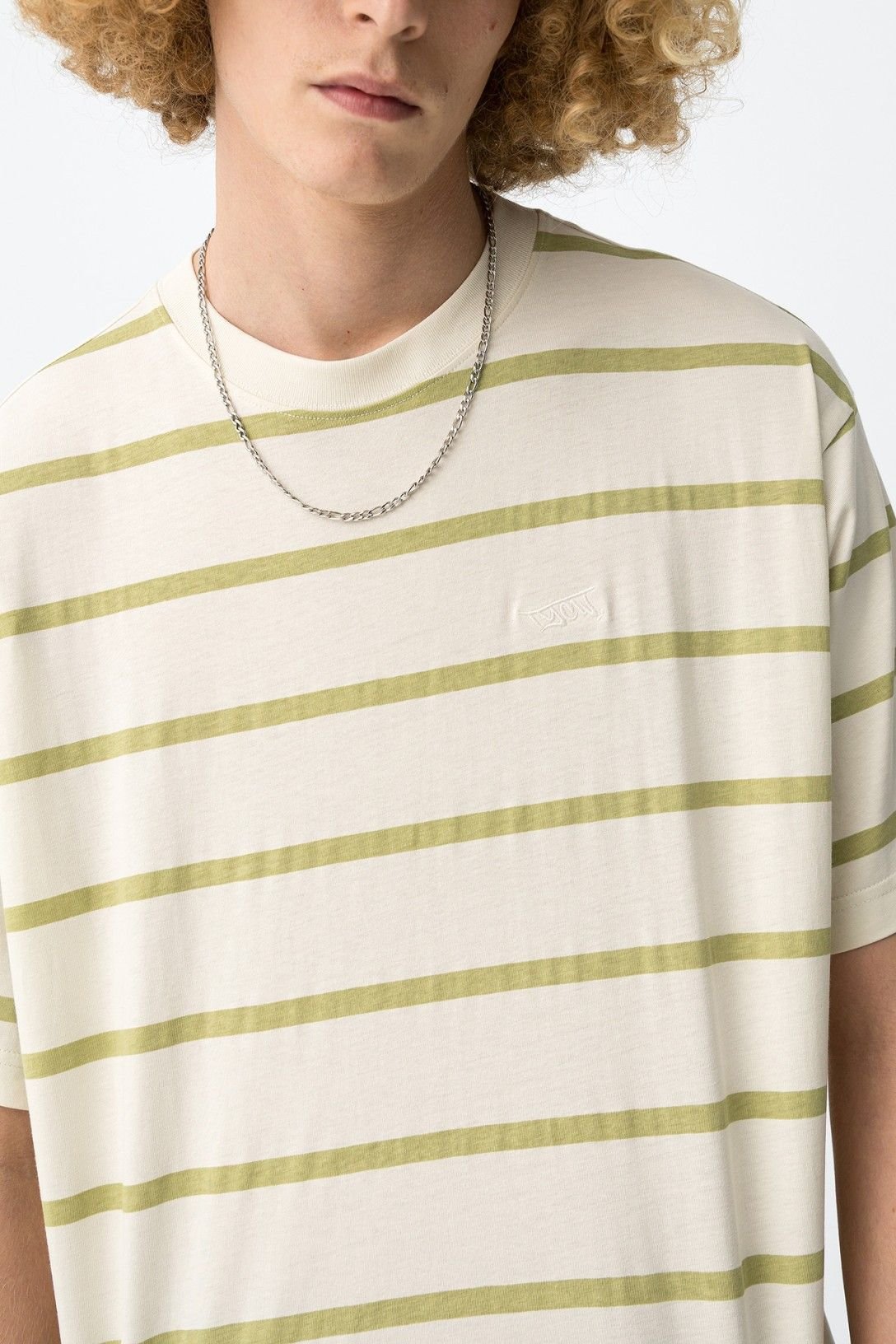 T-shirt de cor bege com riscas horizontais largas, corte relaxed e manga curta, vibe casual descontraída.