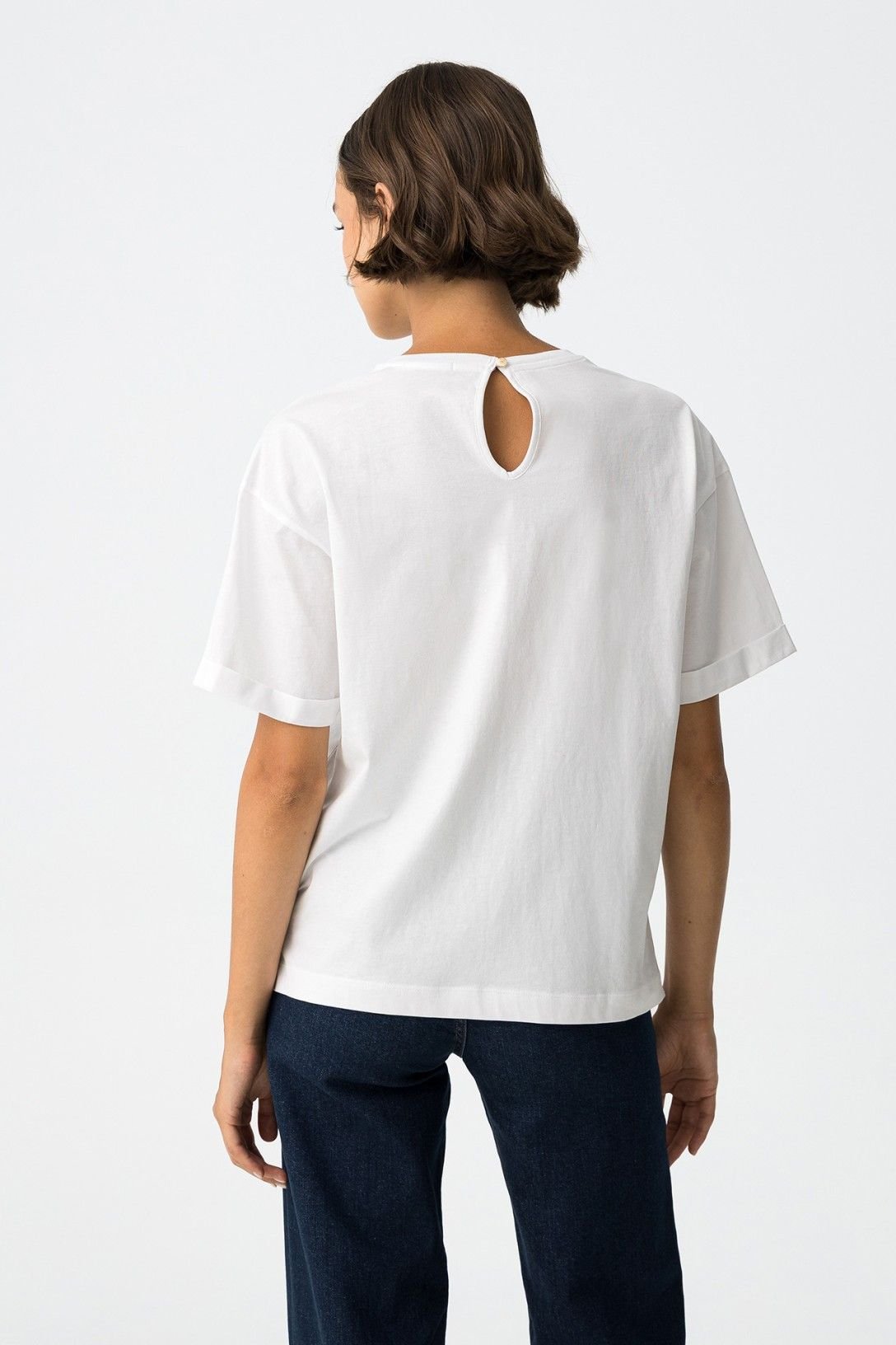 T-shirt relaxed fit de algodão, com estampado de mensagem em alto relevo, decote redondo e manga curta.